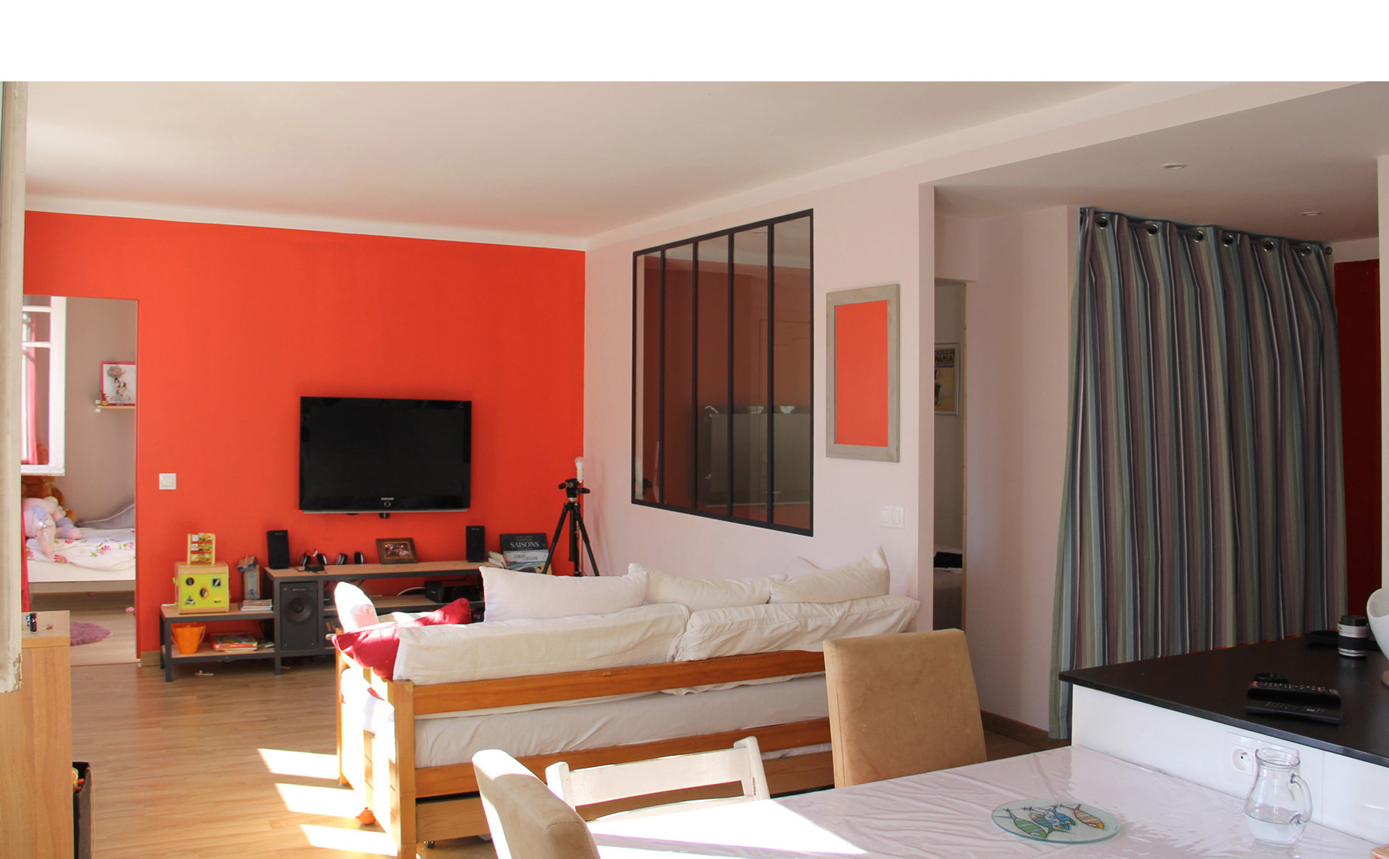 L’objectif de ce projet était de créer une deuxième chambre dans un appartement de 60 m² mono-orienté en limitant les travaux trop important.